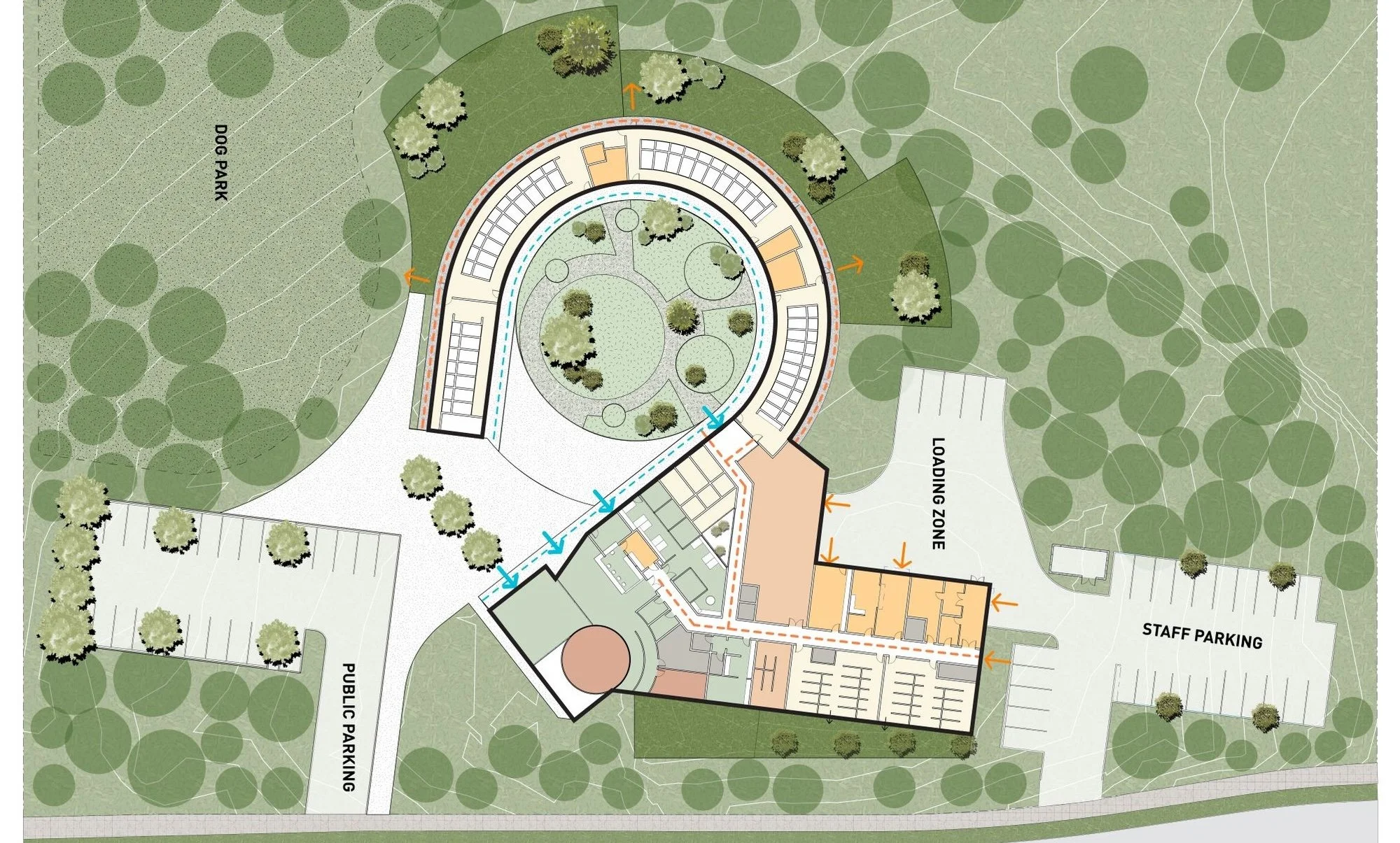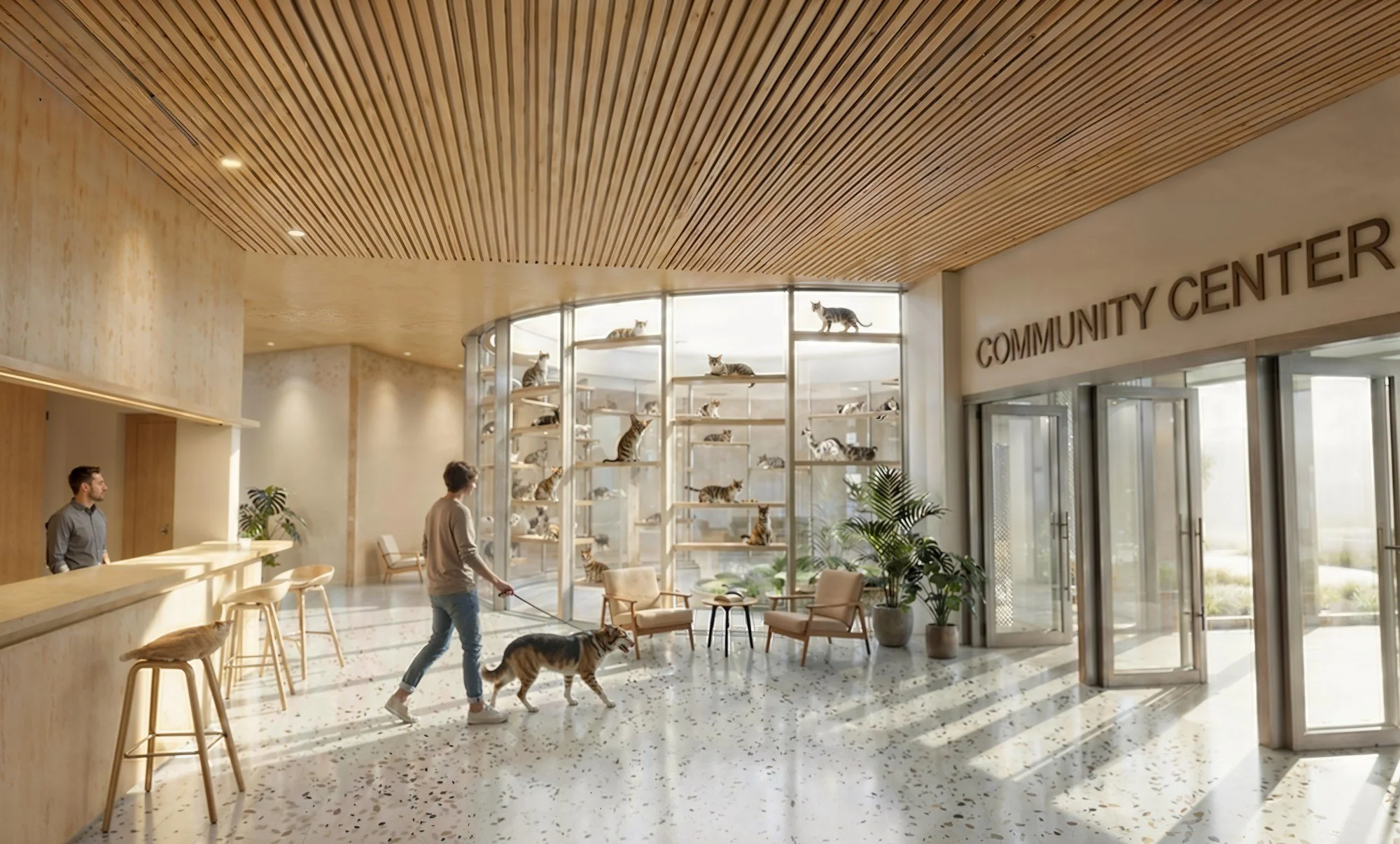 A new modern Animal Services facility would focus on expanded and improved animal care and recovery, better adoption and education spaces, and more efficient operations.